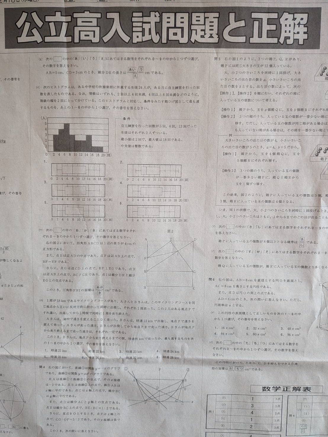 大設問については、例年通りであった。出題内容も、問2の直線“ℓ”を中心とした三角形の回転体の問題、問3の(ア)は円と相似についての問題、(イ)は箱ひげ図の問題で、今回で4年連続の出題となった。箱ひげ図の問題は3つの条件からヒストグラムを絞る問題で、昨年よりはかなり易しくなったと言える。問4の関数の問題は例年通りのものであったが、(う)は計算途中で分数値となり、正確な計算力が求められた。そしてもう一つのポイントは、面積比を使うことができたか否かで時間短縮につながった。問5は確率の問題で、条件を整理して問われているものを丁寧に数え上げることができれば正答できた。問6の円柱の空間図形は、円柱の中に破線で画かれている三角形の“角D”が直角であることに気が付けるかがポイントとなった。